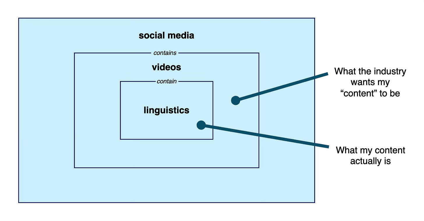 But this premise is flawed. To me, “content” is a means to an end, not the end itself. I make linguistics videos not because I want to make videos, but because I want to communicate about linguistics. In this sense, linguistics is the “content” and my videos are the medium, which would go against the other definition.